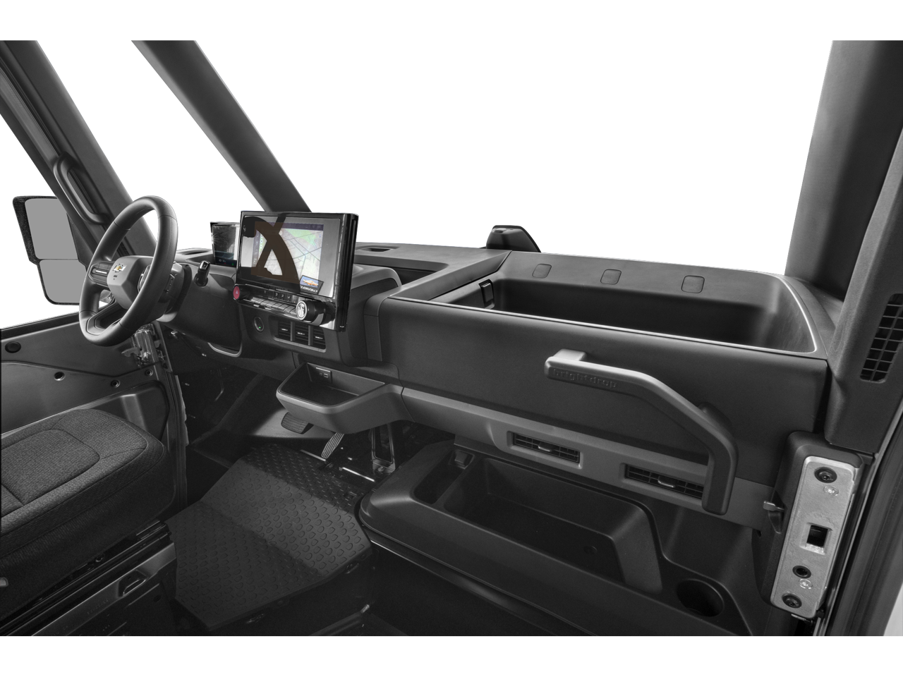 • Storage bins upper instrument panel on driver side, upper instrument panel on curbside, lower floor area on curbside